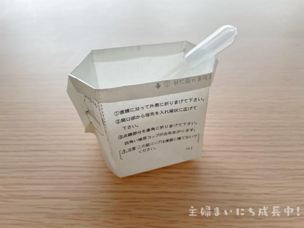届いたキットを使って採尿します。