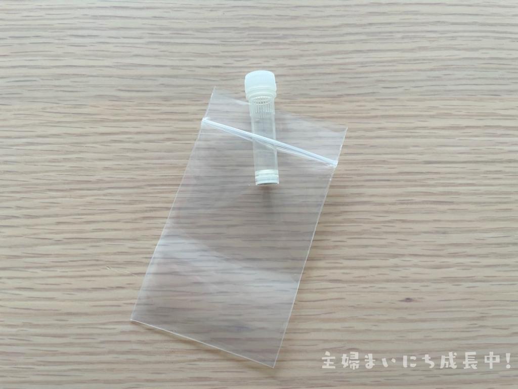検体チューブを透明ジップ袋に入れ、さらに緑の検体提出袋に入れます。